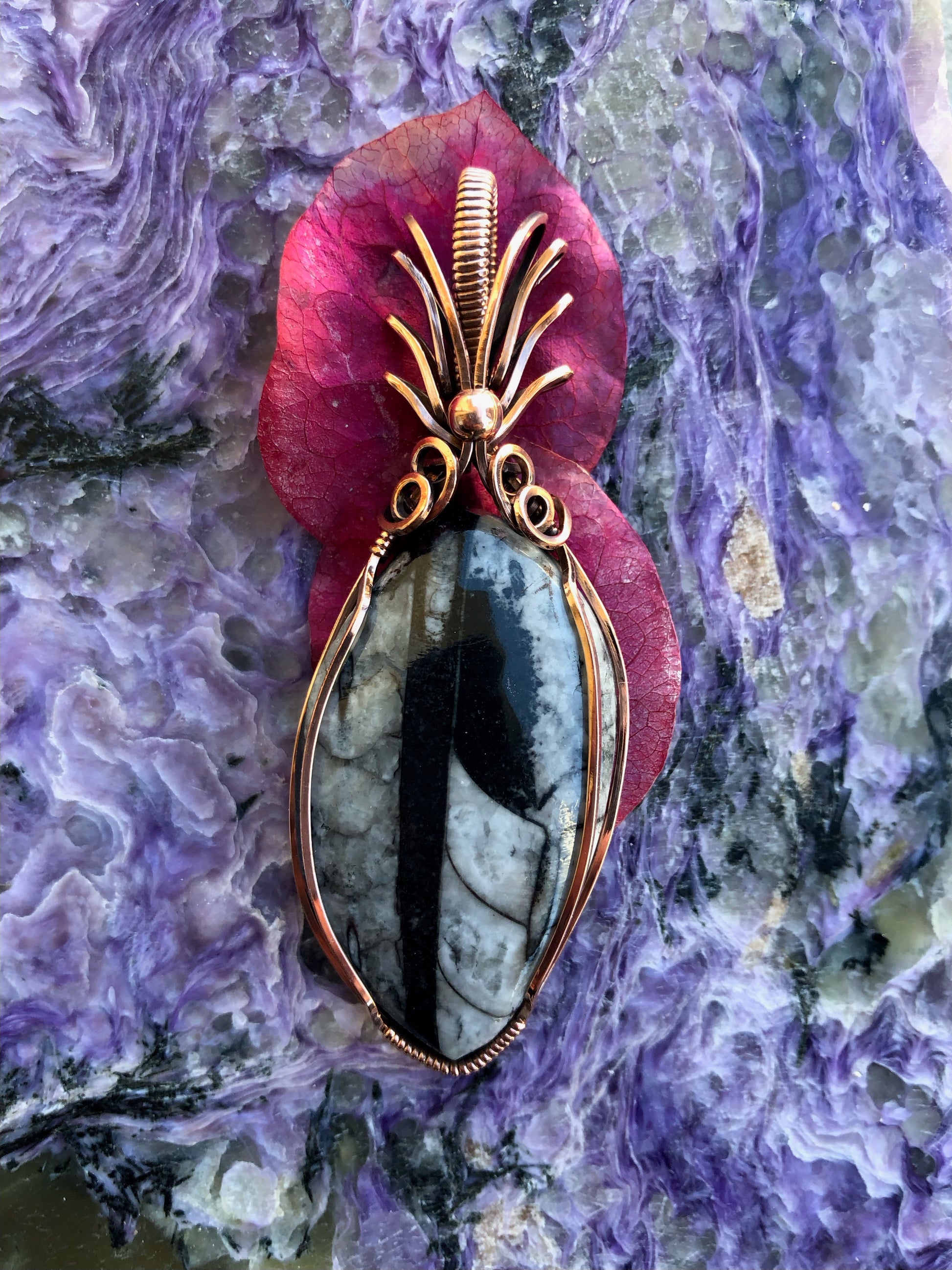 This Fascinating Fossil of the Orthocera is highlighted by Joseph in Wire Wrapped Copper. This excellent pendant promotes well-being, groundness and connection to ancient wisdom.